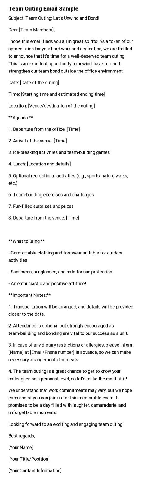 Team Outing Email Content Template - Learn how to write a professional and polite email for. Find out the types, formats, and benefits of team. Dear [team members], i hope this email finds you all in great spirits! We’ve got you covered with team outing email sample examples that you can easily modify to fit your specific needs. Find tips, formats, and examples.